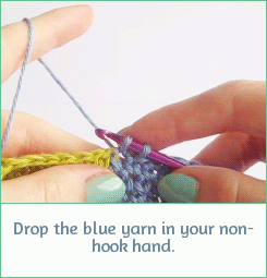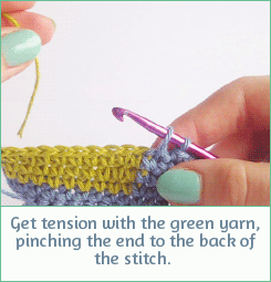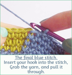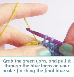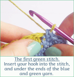 5.钩针插入黄色部分的第一针短针中,将蓝色线置于钩针上方,这样有利于藏线